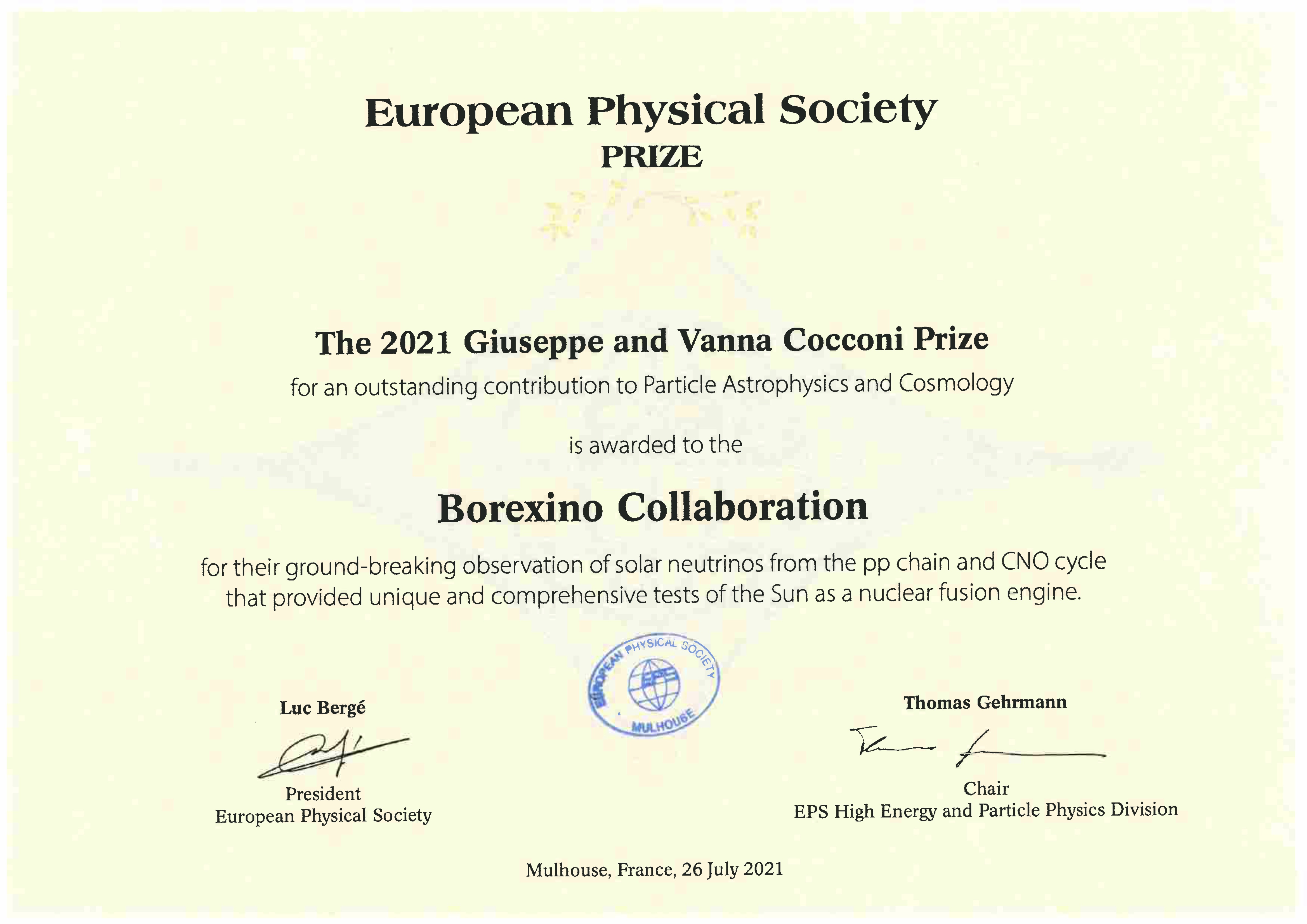 Today, on 26 July 2021, the Giuseppe and Vanna Cocconi Prize has been awarded at the conference of the European Physical Society on high-energy physics (EPS-HEP 2021).