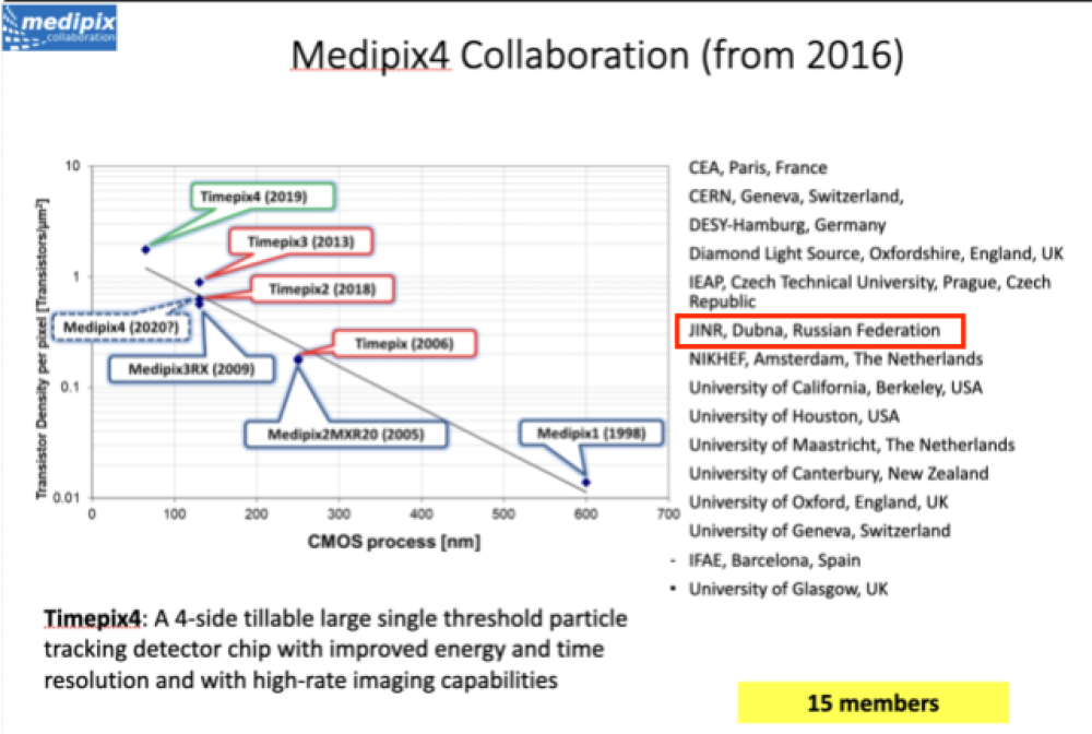 В 2016 году была сформирована новая коллаборация Medipix4. В ее состав вошли 15 научных центров со всего мира, в том числе и группа из ОИЯИ. В результате этих изменений положение нашей группы в коллаборации перешло на качественно новый уровень: мы теперь разработчики и создатели пиксельной микросхемы нового поколения.
